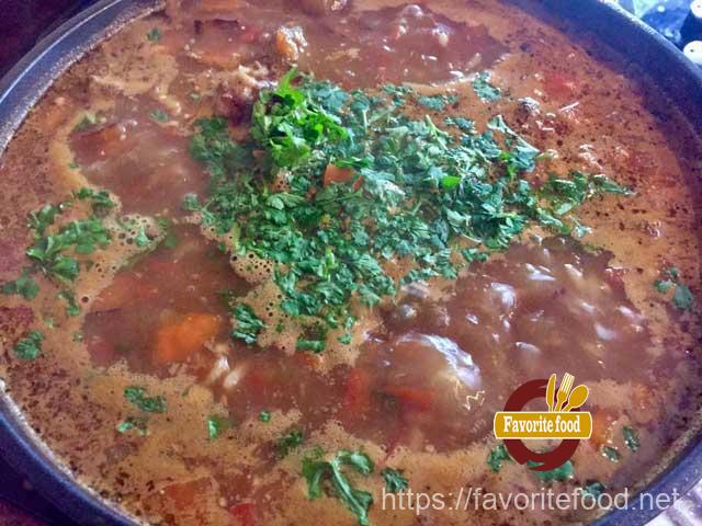 • Высыпаем нарезанную петрушку, накрываем кастрюлю крышкой, выключаем огонь. Харчо готов.