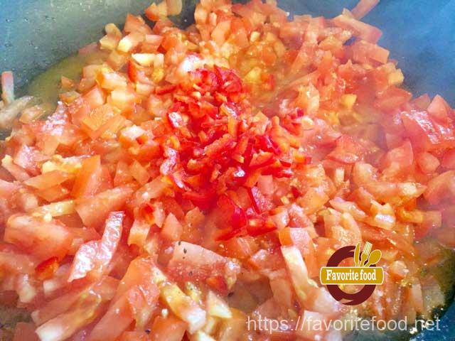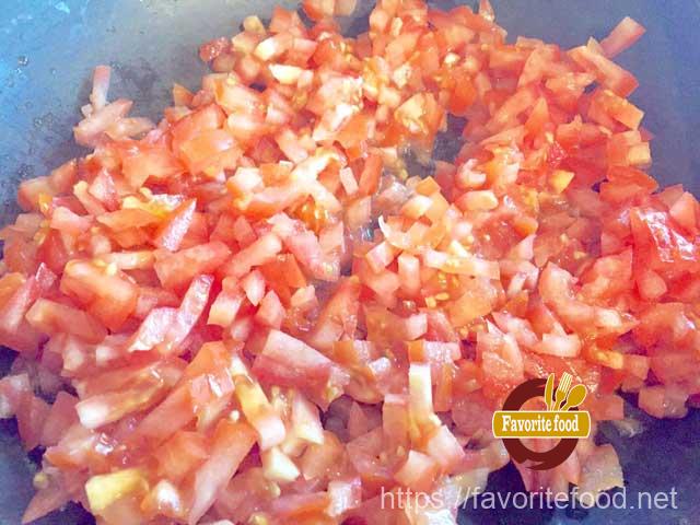 • Разогреваем сковороду, и не добавляя масло, выкладываем нарезанные помидоры в сковороду. К помидорам добавляем щепотку соли, чтоб они быстрее выделили сок. Доказано, что термически обработанные томаты становятся более полезны для организма человека, чем свежие.