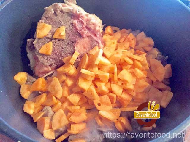• Отправляем нарезанную морковь в кастрюлю с мясом и косточкой.