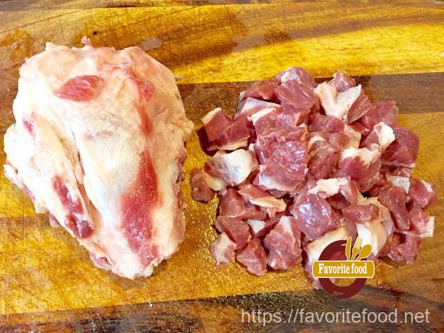 •   Берем мясо на кости, для харчо – это говядина, моем и срезаем с косточки мясо вместе с жирком, нарезаем его на кусочки по 1,5-2 см.