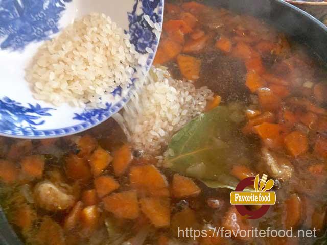 •   Засыпаем в кастрюлю к мясу и овощам рис. Перемешиваем и варим еще 15 минут.