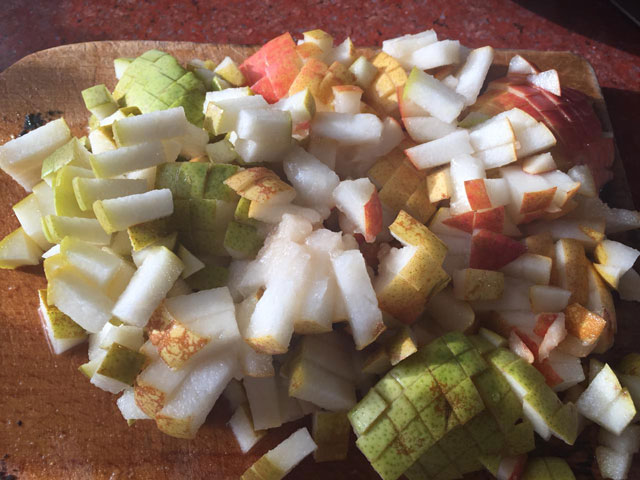 • Груши моем, удаляем сердцевину с семенами и хвостики. Нарезаем груши на кубики.
