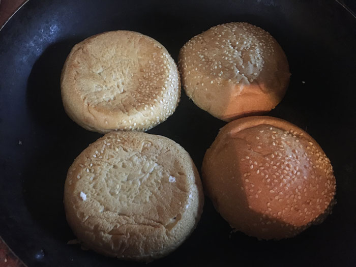 - Булочки разрезаем пополам и подрумяниваем их на горячей сковороде ( без масла)