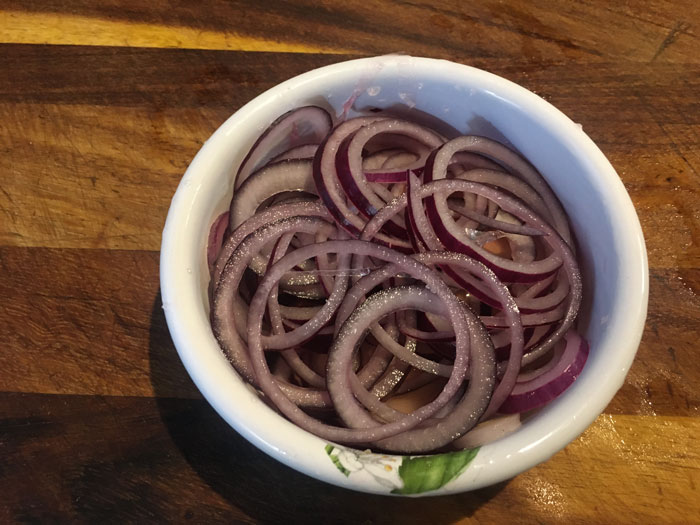 - Кладем нарезанный лук в небольшую чашку. Смешиваем винный уксус, воду и сахар. И заливаем этим маринадом лук. Хорошо перемешиваем его. И пока готовим гамбургеры не будем забывать перемешивать лук.
