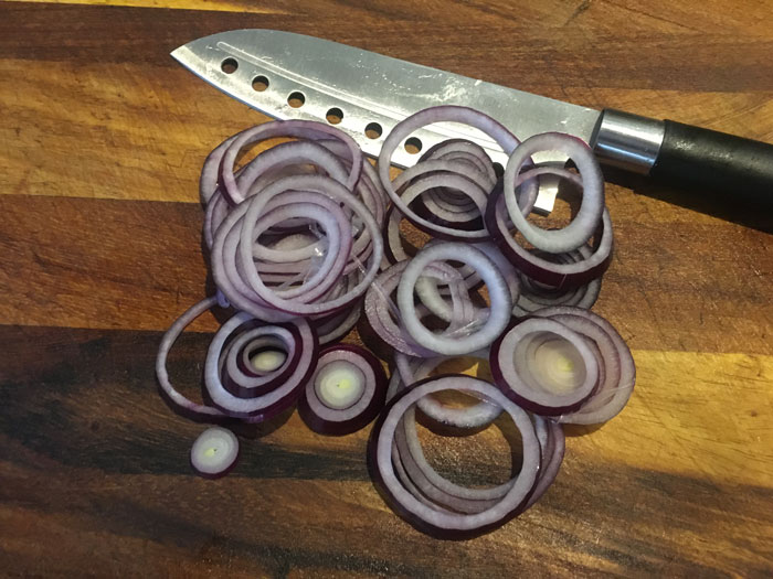 - Режем лук на тонкие кольца.