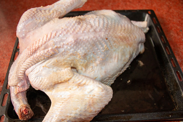 - Промаринованную индейку достаем из маринада, обтираем бумажными салфетками. Осторожно засовываем руку под кожу индейки, разрываем связки между кожей и тушкой индейки, стараясь не порвать кожу. Так нужно отделить кожу на грудке, ножках и боках птицы.