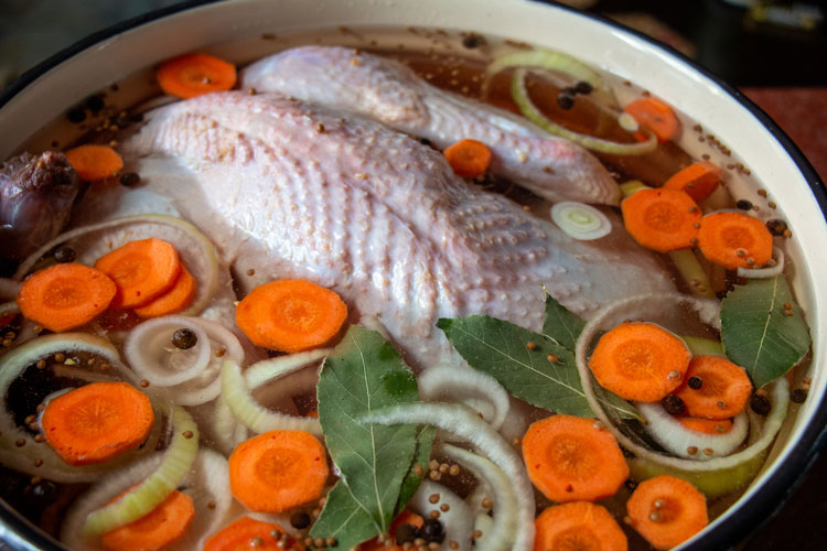 - Сделаем маринад для индейки. Вскипятим чайник воды и выльем кипяток в большую миску с уже засыпанными в нее солью и сахаром. Перемешаем все до полного растворения сахара и соли. Кидаем в миску кориандр, перец душистый, лавровый лист, нарезанный полукольцами лук и нарезанную морковь. Идейку выкладываем в кастрюлю подходящего размера, заливаем туда маринад и добавляем холодную воду до полного покрытия индейки. На вкус маринад должен быть слегка пересоленным. Оставляем в прохладном месте на двое суток (минимум сутки)