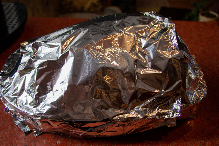 - Выкладываем индейку грудкой вниз в подходящую форму. Закрываем фольгой так, чтоб между фольгой и индейкой был воздух . В фольге делаем отверстия для пара. Ставим в разогретую до 220 градусов духовку. Через 40 минут убавляем температуру до 180 градусов и жарим часа 2,5 ( для индейки весом около 5 кг) , снимаем фольгу чтоб подрумянить индейку.