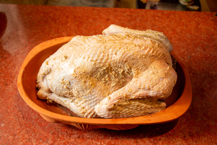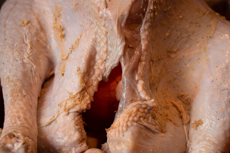 - Натираем масляной смесью всю индейку как снаружи, так и под кожей.