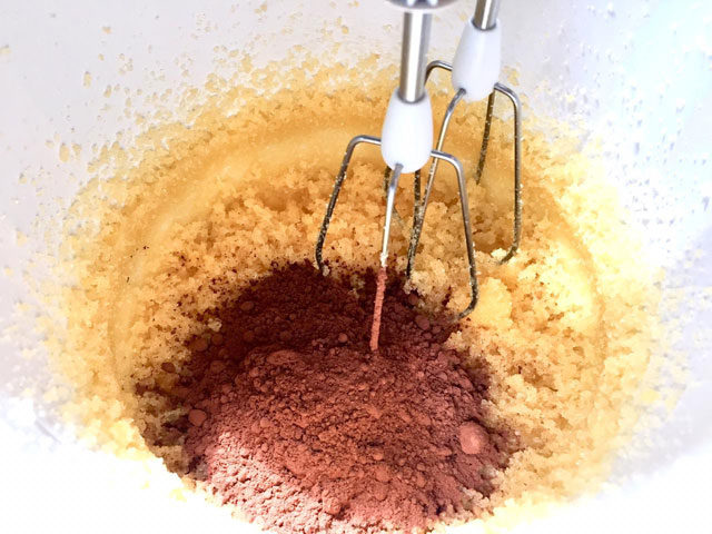 - К получившейся смеси, порциями, добавляем 20 г какао-порошка, хорошо перемешиваем.