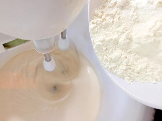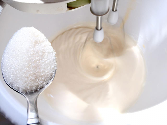 сахара, тоже порциями. - Продолжая взбивать, добавляем в смесь