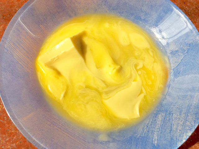 муку, так же порциями. - Растапливаем в микроволновке 50 г сливочного масла.