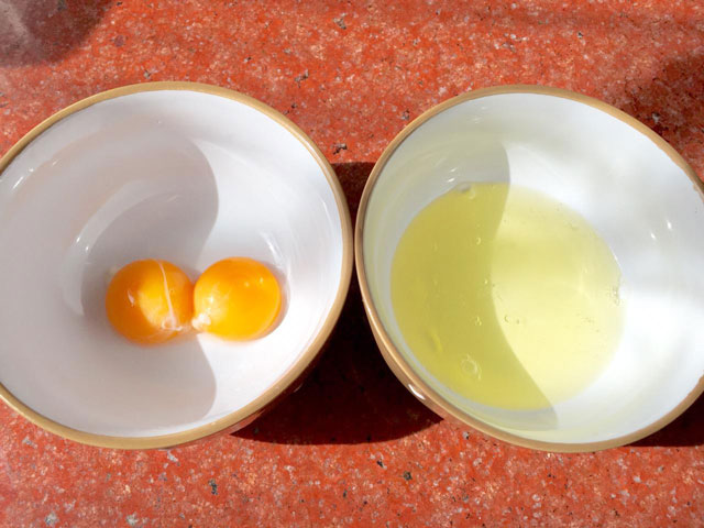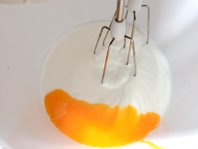 из холодильника. - К взбитым белкам добавляем желтки по одному, продолжая взбивать.