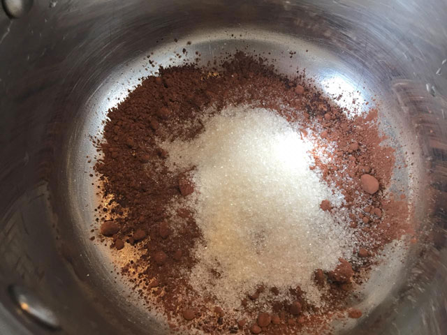 - К какао-порошку высыпаем 20 г сахара. Перемешиваем. Ставим кастрюльку на слабый огонь. Добавляем к смеси воду. Перемешиваем до полного растворения сахара. Затем, добавляем 30 г сливочного масла, перемешиваем до однородности. Выключаем огонь.