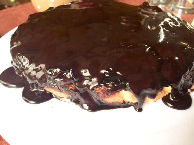 - Выливаем глазурь на наш пирог так же, как и крем – в середину. Глазурь