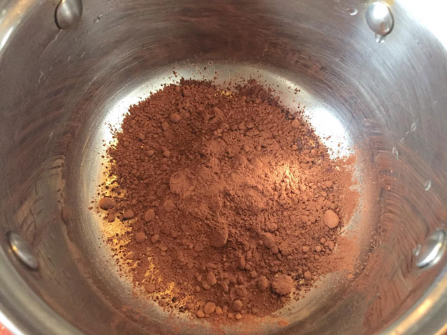 - Через час готовим глазурь. Это совсем просто. В небольшую кастрюльку высыпаем 20 г какао-порошка.