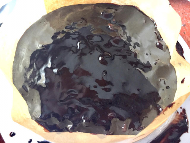 - На слой вишни выливаем крем. Льем крем в середину коржа, крем сам растечется по краям. Бортики из бумаги не дадут крему растечься за пределы коржа. Отправляем в холодильник на час пропитываться кремом.