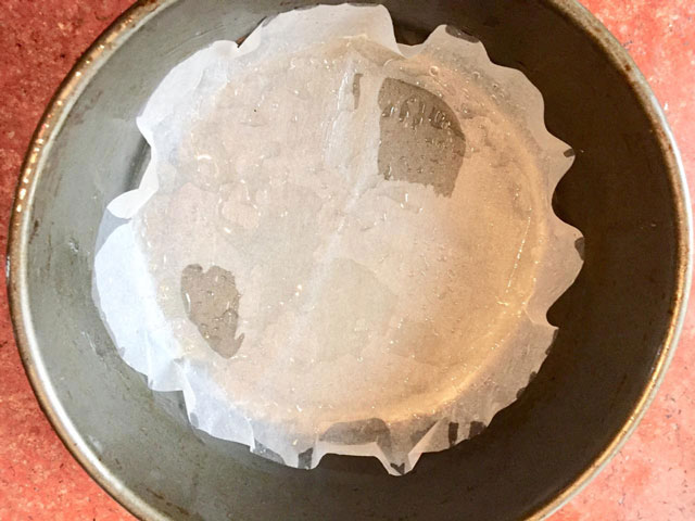 вырезала из бумаги для выпечки круг чуть большего диаметра дна моей формы.