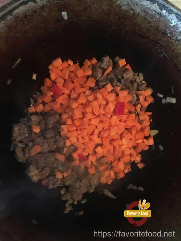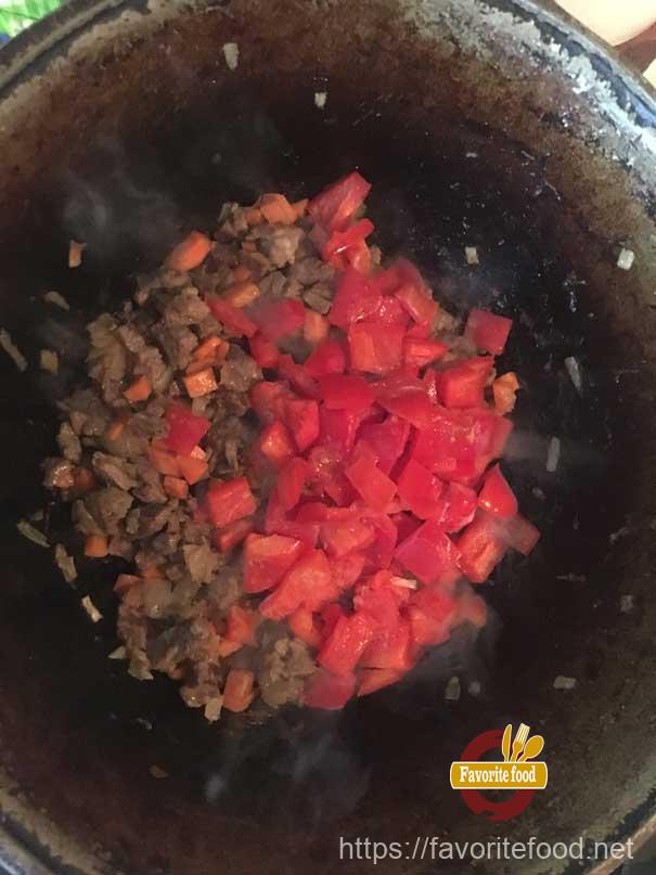 - Следом высыпаем морковку. Перемешиваем все хорошо. Обжариваем пока морковь не станет мягкой и ароматной. Вот теперь время опустить и болгарский перец. Опускаем , не забывая все перемешивать, жарим пару минут.