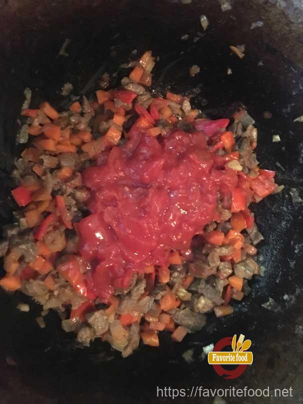 - Тем временем разводим томатную пасту в 100 гр. воды. Выливаем это все в казан. Перемешиваем снова все. Ждем пока снова не выпариться половина жидкости. Вот теперь добавляем картофель и редьку. Все снова перемешиваем и жарим еще 5-6 минут. Не забывая перемешивать наш соус.