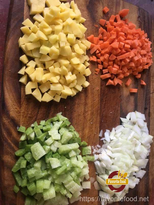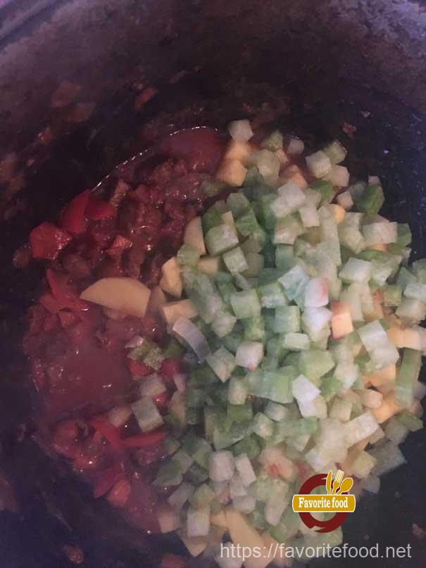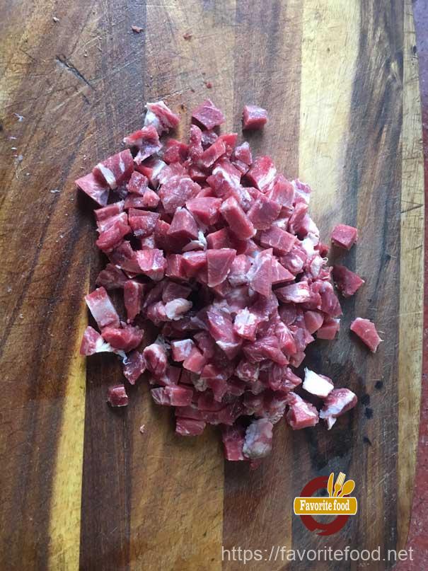 - Нарезаем мясо кубиками по 0,5-1 см. Овощи очищаем и тоже нарезаем кубиками. Помидор лучше сначала ошпарить кипятком или поджарить немного над открытым огнем, чтоб легче снять с него шкурку, а потом порезать на кубики (зимой можно использовать консервированные в томате помидоры.)