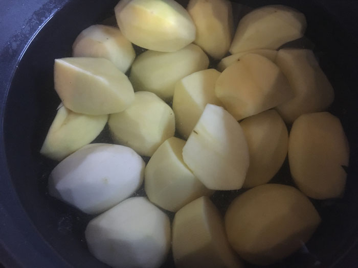- Картофель нарезаем одинаковыми ломтиками. Складываем в кастрюлю, заливаем холодной водой и ставим вариться на огонь. Воду подсаливаем.