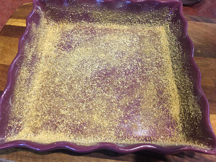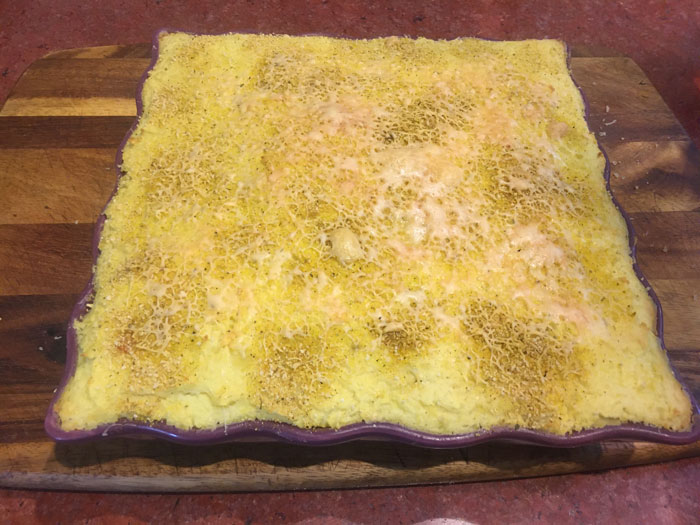 - Сверху закрываем все пюре. Посыпаем панировочными сухарями и натертым сыром.