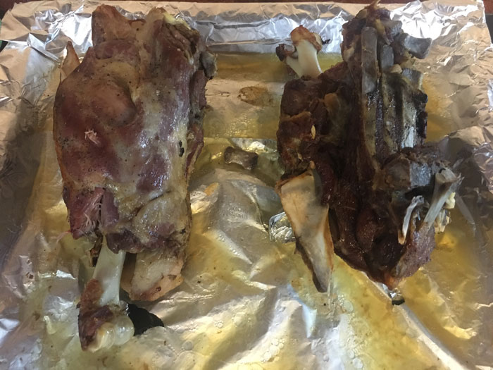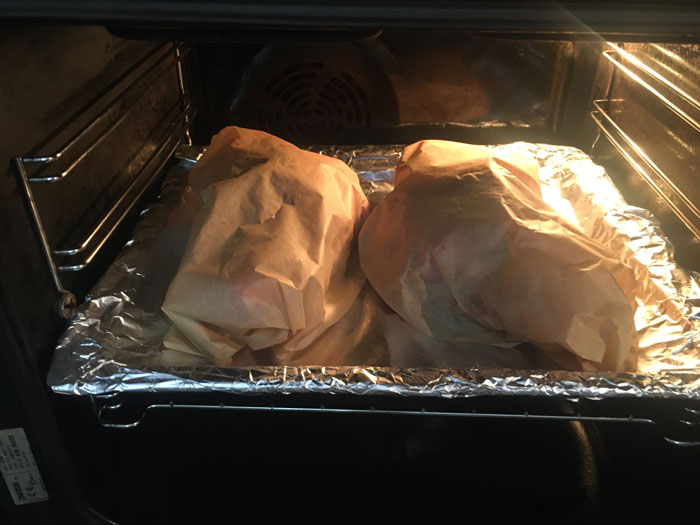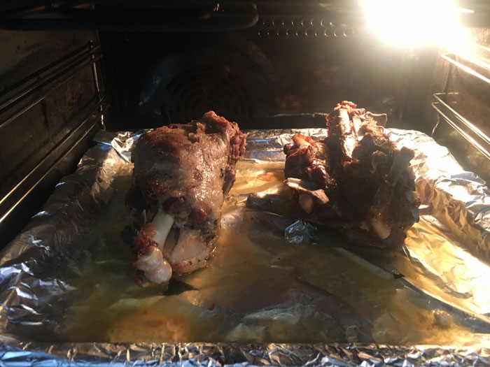 - Укладываем на противень, выливаем в противень стакан воды и отправляем в разогретую до 170 градусов духовку, на 3 часа 45 минут.
