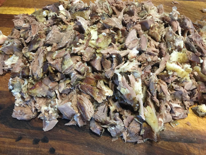- А пока есть время разделать мясо. Оно должно очень легко отделятся от костей. Можно прям руками нарвать его на мелкий кусочки или нарезать потом ножом.