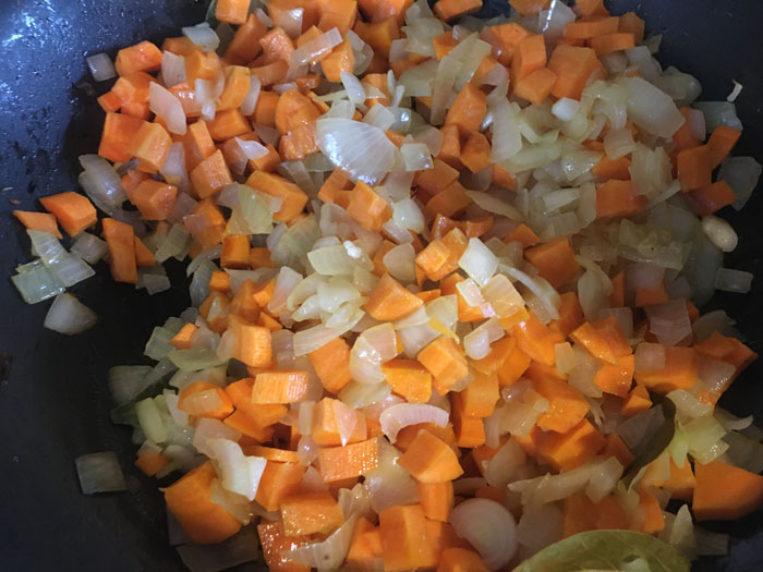 - Туда же выкладываем и морковь с сельдереем. Перемешиваем все и жарим минут 20. Если будет пригорать добавляйте жира с бульоном от мяса.