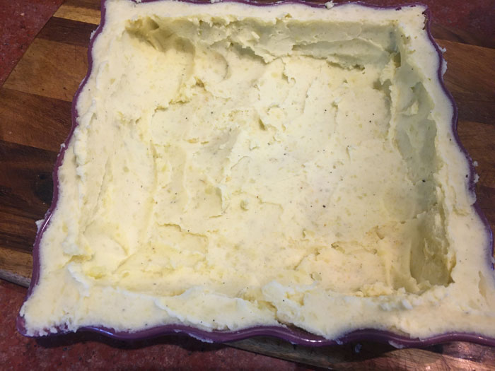 - Картофельное пюре распределяем равномерно по дну и стенкам формы.