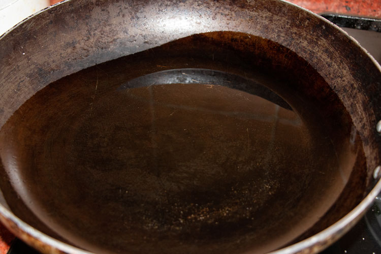 • Подготовка в принципе закончена. Да заранее надо разморозить и морепродукты, и зеленый горошек, если это все заморожено было. Ставим на плиту большую сковороду и наливаем в нее масло.