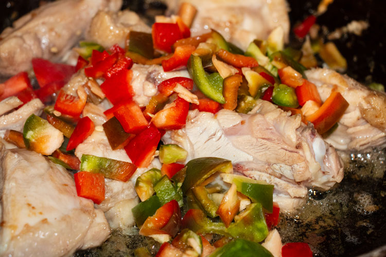 • Курица стала немного золотистой, солим ее и добавляем болгарский перец.