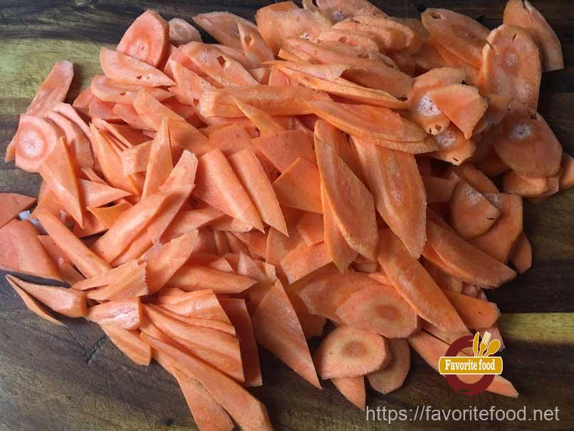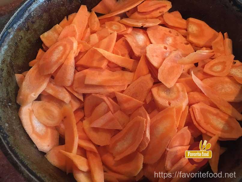 - Честно говоря, не выдержал и доложил несколько кусочков с косточками. Жир нарезал кубиками по 1,5 см примерно. Морковь режем по диагонали моркови, пластиками толщиной по 2 мм.