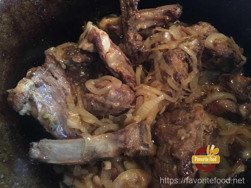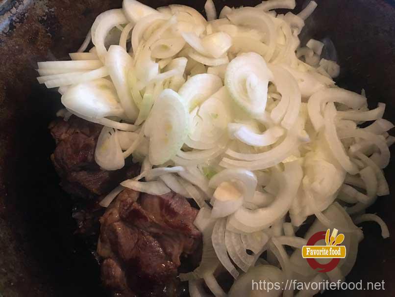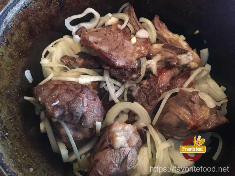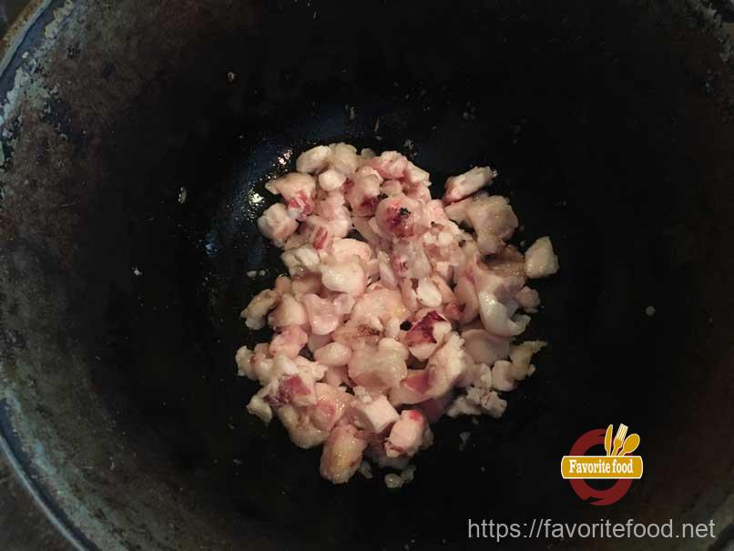 - Для этого рецепта приготовления пока закончены. Рисом займемся позже. Пока же поставим казан на огонь. Разогреем его и выложим нарезанный жир.