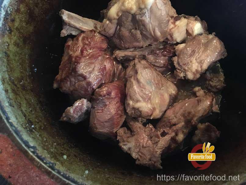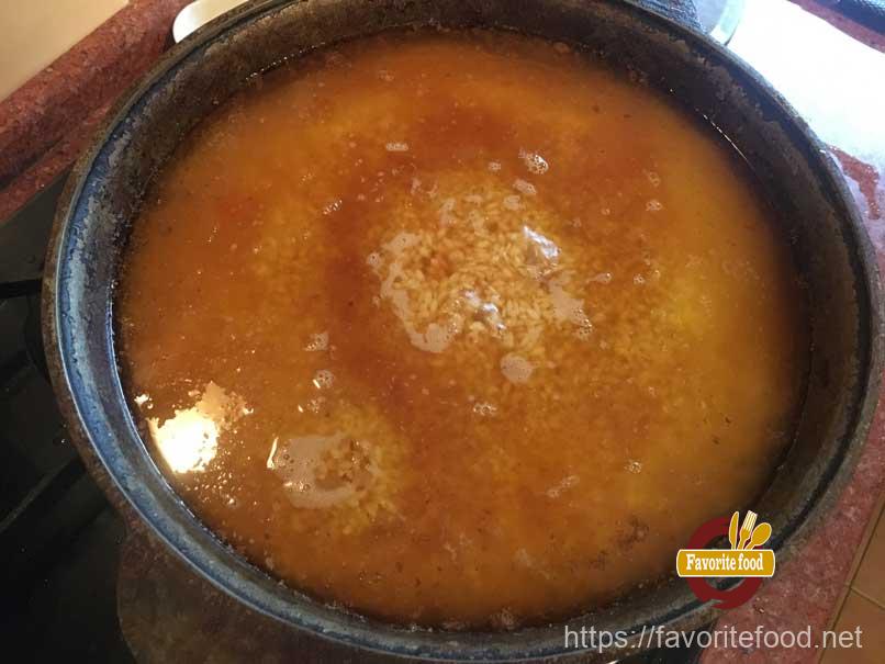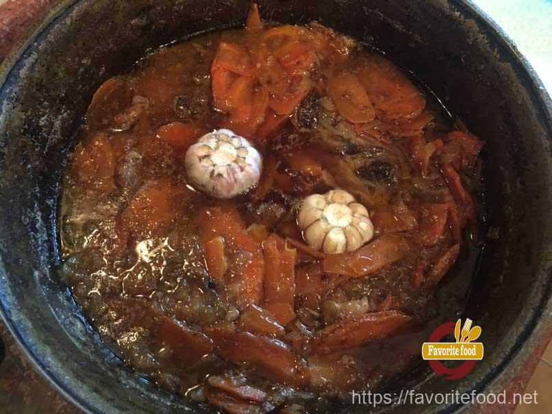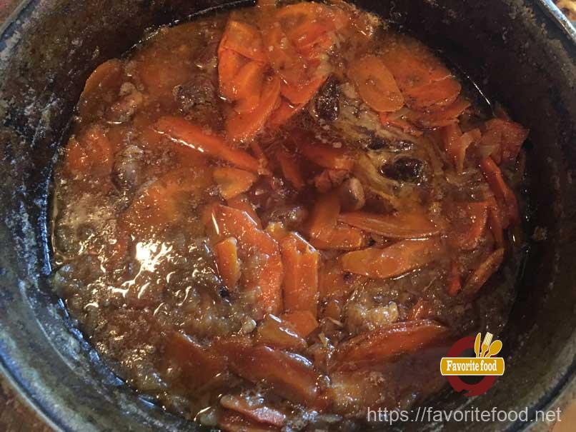 - Даем закипеть и убавляем огонь до минимального. Вот теперь остается набраться терпения. Так как тушить зирвак будем часов 6-7.Примерно за час до окончания тушения зирвака, замочим рис в теплой воде. Чтоб к концу тушения зирвака, промыть его и выложить в казан.