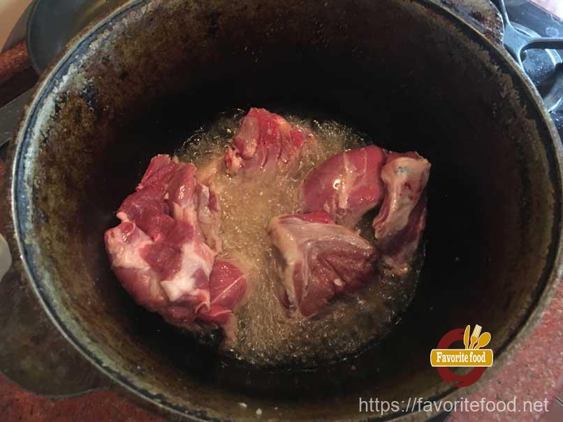 - Если будем готовить на масле, то нальем в казан масло и дадим ему хорошо нагреться. В разогретый хорошо казан опускаем мясо.
