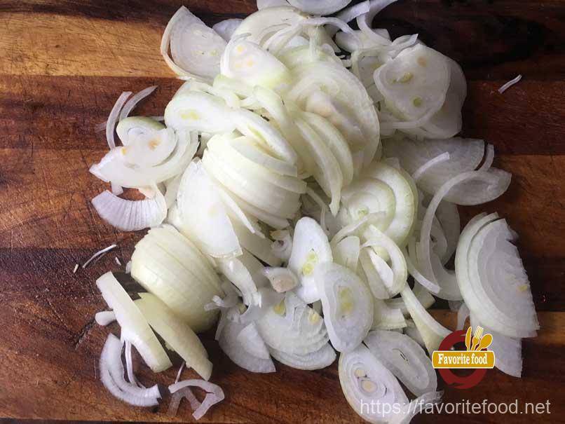 - Слишком широкие пластики разрежем пополам. Лук нашинкуем полукольцами по 3-4 мм толщиной.