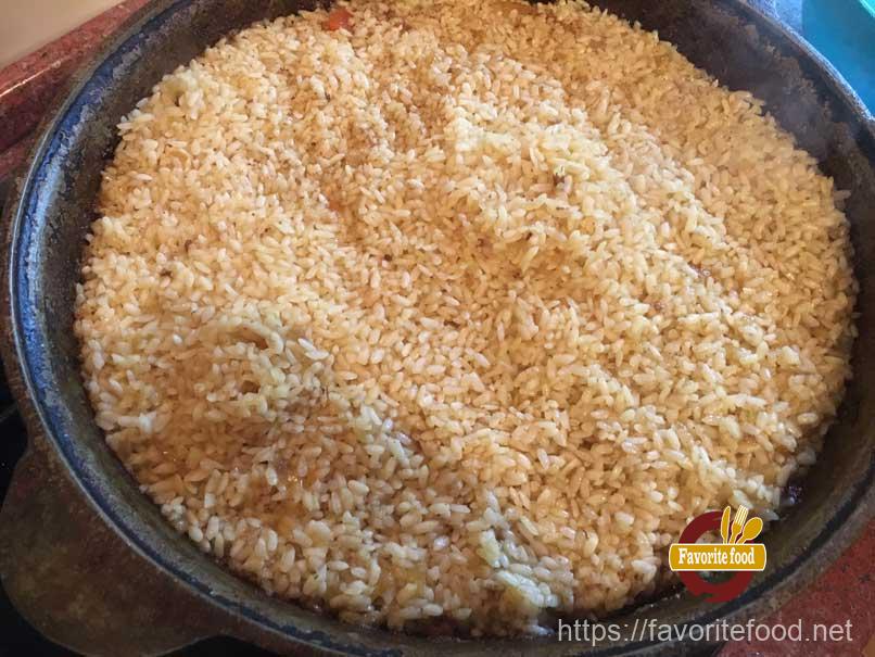 - Теперь очередь за рисом. Осторожно выкладываем рис в казан и одновременно разравниваем его. Чтоб он лег ровным слоем.