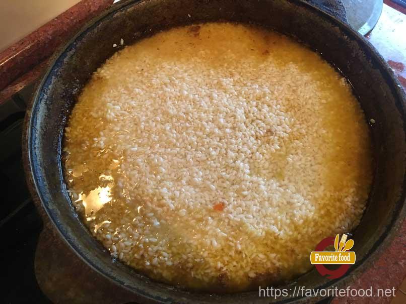 - Подольем воды, до уровня примерно 1-1,5 см над рисом. Не надо переливать, лучше добавить потом. Огонь делаем максимальным .Ждем пока зирвак снова закипит.