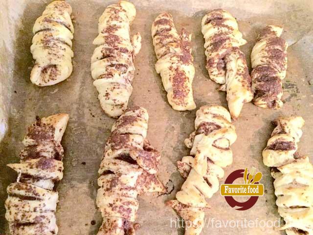 - Противень застилаем бумагой для выпечки, смазываем её растительным маслом и выкладываем на противень все получившиеся рулетики с шоколадом, соблюдая дистанцию между рулетиками, поскольку тесто поднимется. Выпекаем в духовке при 180 градусах 15-20 минут. Проверяем деревянной шпажкой или зубочисткой готовность рулетиков с шоколадом.