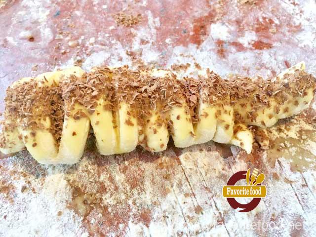 - Получившийся рулетик смазываем сверху яйцом и еще посыпаем шоколадом.