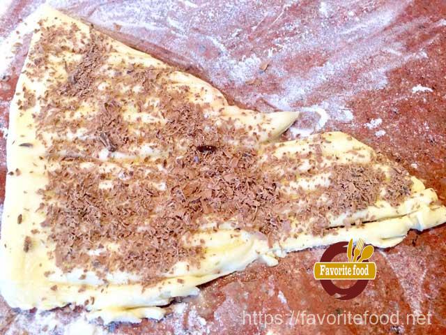 - Кисточкой смазываем поверхность прорезанного треугольника из теста яйцом. Яйцо выполняет роль клея для шоколада. Обильно посыпаем натертым шоколадом треугольник из слоёного теста.