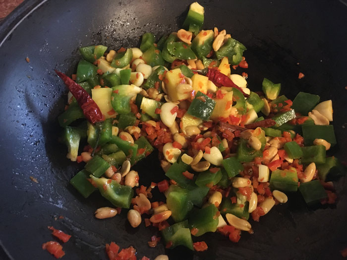 - В вок наливаем пару ложек масла. Бросаем в разогретое масло бланшированный арахис, чеснок имбирь, корицу, стручки острого перца, сычуаньский перец, нарезанный свежий острый перец и семена фенхеля. Обжариваем все 2 минуты на среднем огне. Постоянно помешивая. Затем добавляем и нарезанный кубиками зеленый перец. Продолжаем жарить еще 6 минут. Овощи выкладываем с вока в тарелку.