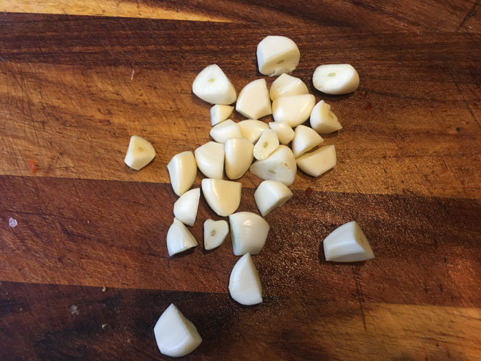 - Чеснок очищаем и каждый зубок разрезаем пополам.
