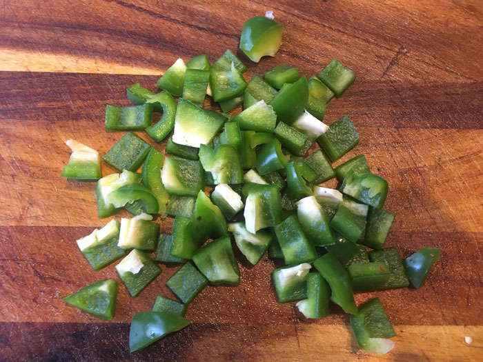 - Зеленый перец так же чистим и нарезаем кубиками.