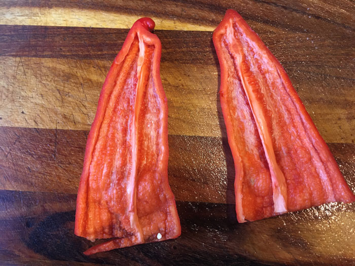- Займемся пока овощами. Разрежем пополам острый перец ( или полугорький) уберем все семена и мелко нашинкуем его.