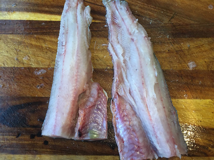 - Очистим и выпотрошим рыбу. Постарайтесь убрать кости. Срежем филе с рыбы. Конечно лучше подходит крупная рыба.