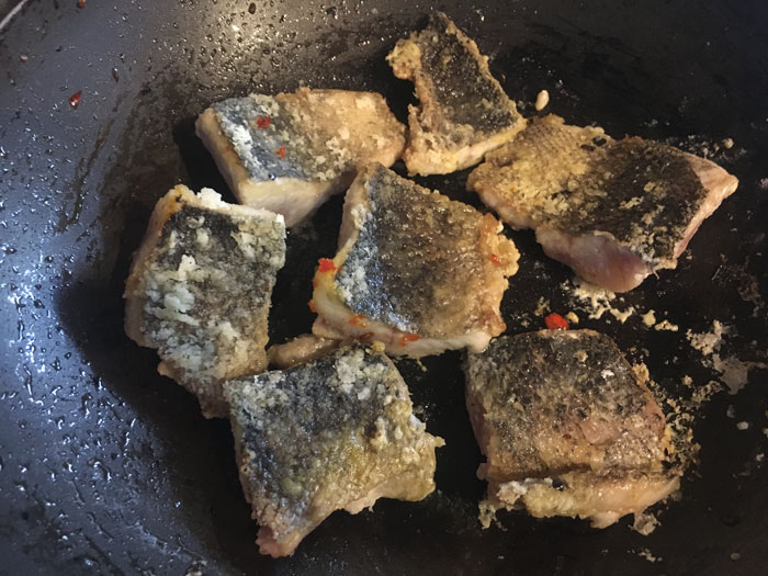 - В вок добавляем масло, разогреваем его хорошо. Кладем в разогретый вок рыбу, шкуркой вниз. Обжариваем 2 минуты.