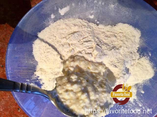 •  В получившуюся смесь постепенно вмешиваем 100 г муки. Тесто для сырников готово.